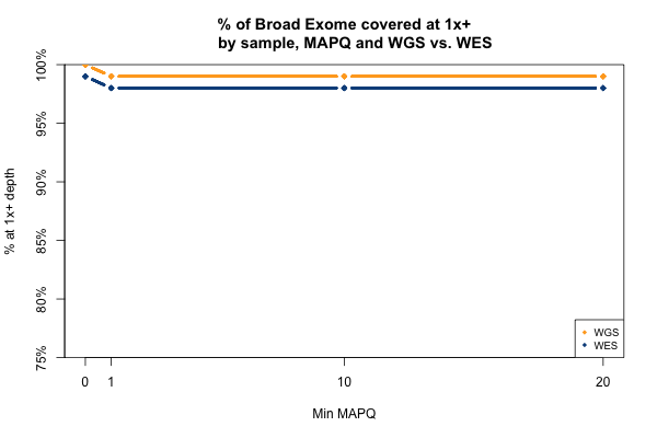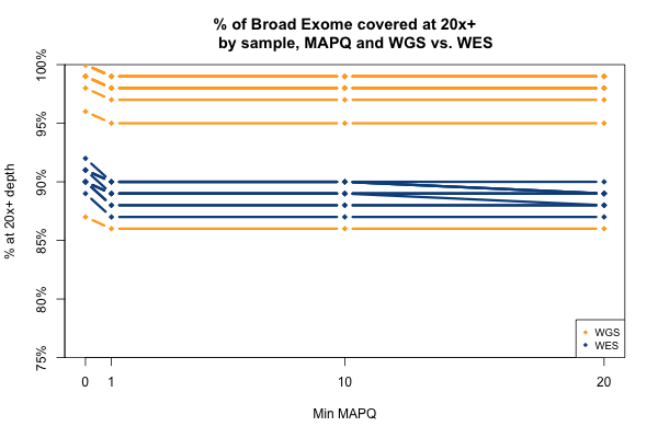 All of the above plots are concerning mean coverage across the entire target set. A different metric that might be more pertinent to callability is the percent of the target that is covered at 20x depth or better. Therefore I computed for each of the 11 samples what percent of the Broad Exome is covered at 20x or better, varying the minimum MAPQ threshold but applying no base quality cutoff. As the plot below shows, all but one of the WGS samples has > 95% of the exome covered at ≥ 20x when all reads are included, while the WES samples cluster closer to 90%. In both cases, you drop below the 20x threshold in about 1% of the exome by requiring that reads have MAPQ > 0. Requiring MAPQ of 10 or 20 doesn’t change things much.