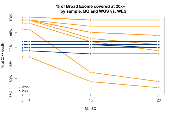 The comparable picture 20x+ depth stratifying by base quality is more predictable: as above, the WGS but not WES samples here take a hit at the higher base quality cutoffs: