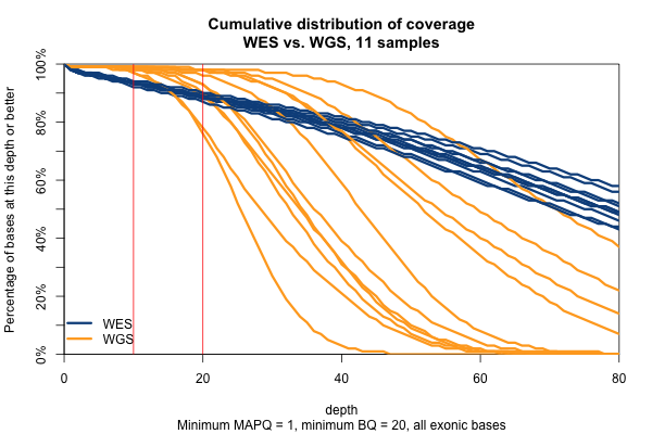 In this post, I’ll explore the “callability” of these 11 WES samples: how much of the targeted exome is covered at a depth where one could hope to call variants, and how many variants are missed, and why? We’ll should say up front that this isn’t a product comparison – the WGS on these samples is of much higher quality than is standard these days, and our exomes are comparatively out of date, so this post cannot directly inform the “WES vs. WGS” decision.