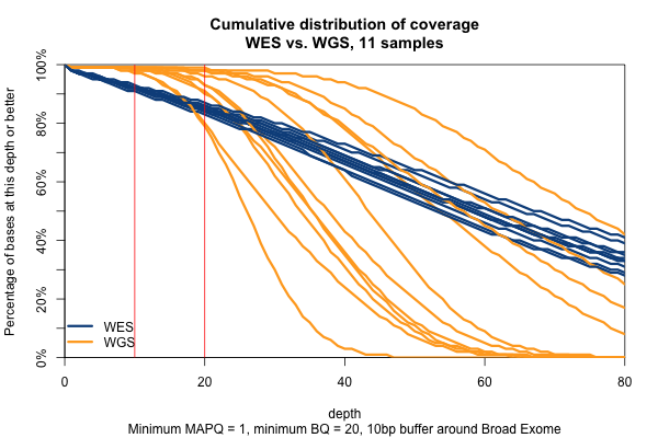 All 11 samples are plotted in blue and yellow above — you just can’t see them because they overlap perfectly. In all 11 WGS samples, 100% of the Broad Exome is covered with at least 1 read, but only 99% is covered with at least 1 read of MAPQ > 0. In all 11 WES samples, 99% of the Broad Exome is covered by one read, but only 98% by one read of MAPQ >0. Interpretation: about 1% of the exome is just utterly unmappable even with 250bp reads, and 2% is unmappable with 76bp reads.