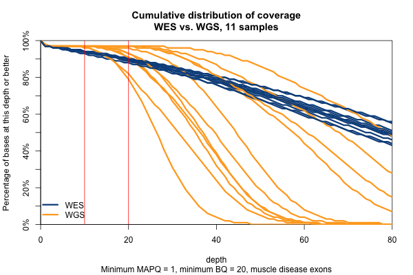The picture is similar when we filter for MAPQ ≥ 1 and BQ ≥ 20 (below). The WGS coverage suffers a bit, particularly due to the base quality threshold, so that some of the WGS now have fewer bases at 20x coverage than WES. At 10x, though, WGS is still the clear winner.