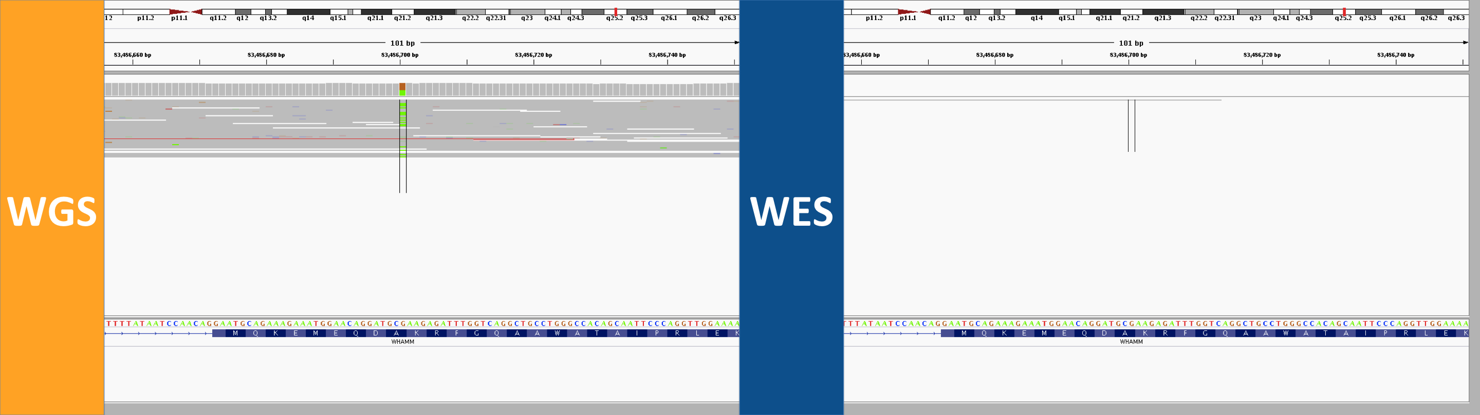 A different advantage of longer reads is their ability to span short tandem repeats or homopolymer runs. I looked at these screenshots because the WES data had called a 3bp in-frame deletion that was absent from the WGS calls. On very close inspection, here’s what happened. RRLLLF became RLLLLF – meaning that an R changed to an L, or an R was deleted and an L duplicated, however you prefer to think of it. The WGS data called a MNP in which tandem T>G and C>A mutations turned an R (TCG) into an L (GAG), a reasonable interpretation. In WES, almost half of reads supported that same interpretation, but a subset of reads (6 of them) failed to span the LLL repeat, so they didn’t see that there were 4 Ls instead of 3, and this resulted in a call of a 3-bp deletion of the R. If you look closely, two of these reads spanned into the F after the Ls, and had mismatched bases as a result. The longer reads in WGS, because they spanned the entire repeat region, gave the more correct call.