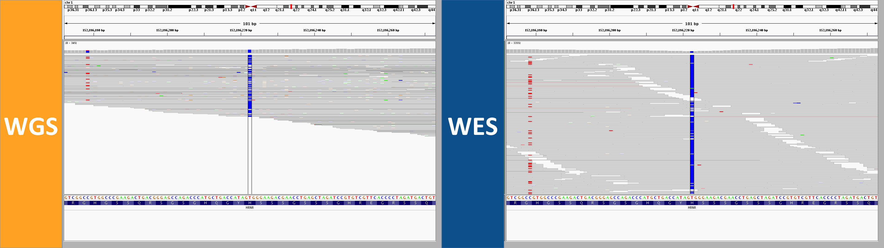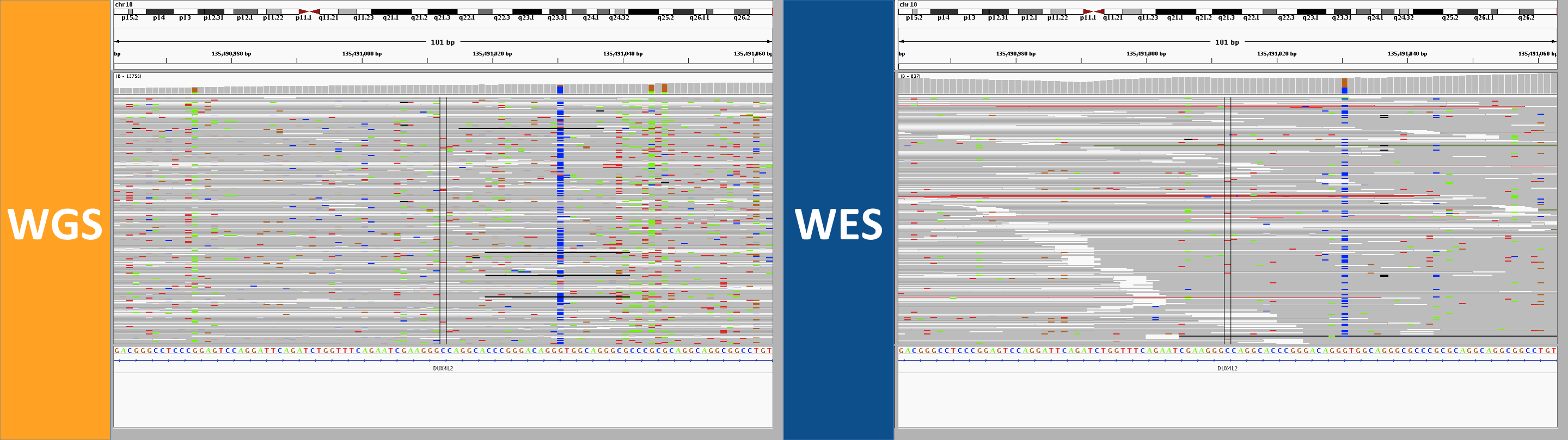 WGS has remained a last resort for a few reasons: it’s still a bit more expensive than WES, it produces more data we have to process and store, and despite some notable recent advances [Ritchie 2014, Kircher 2014] our ability to interpret the pathogenicity of variants in the 99% of the genome that doesn’t code for protein is still a far cry from what we can do with exons. But we still turn to WGS for two main reasons: (1) its superior ability to call structural variations by covering the breakpoints, and (2) its more reliable coverage of the exome itself.