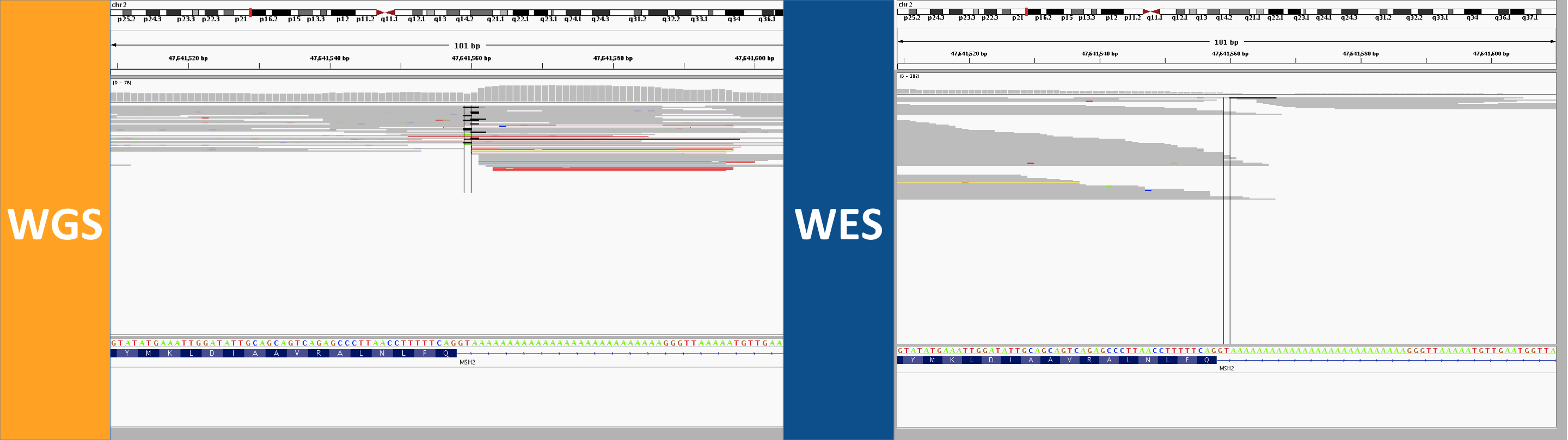 In these screenshots, a homopolymer run of As has contracted by 3 As compared to reference. In WGS, this was called as a left-aligned TAAA>T deletion, as it should be. In WES, no reads spanned the polyA tract, and so no variant was called. At first I thought this was just an issue of read length, but in fact, the polyA tract is plenty short enough to be spanned by 76bp reads in WES. My suspicion is that this relates more to capture. The capture probe for this exon in the Agilent baits file ends at the beginning of the polyA: