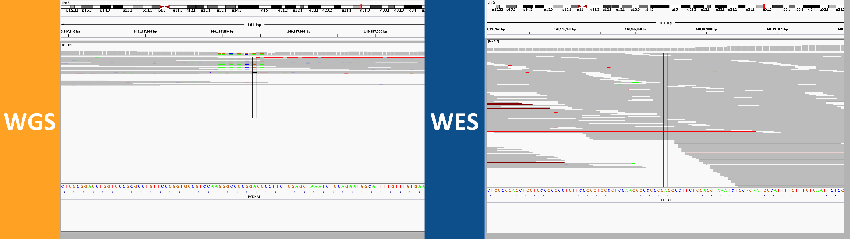 Thus making this a fair comparison. There are 7 non-ref bases in just a 12-bp stretch, making this a big MNP or a non-contiguous series of SNPs, depending on your perspective. They’re quite clearly all on the same haplotype. In WGS, they achieve about a 50% allelic balance, and were called as separate heterozygous SNPs. In WES, the allelic balance is way off, with only two alt reads. I see two possible explanations. The density of mismatches may be enough to throw off alignment of a 76bp read but not a 250bp read, or it may be that so many SNPs so close together is enough to reduce the affinity of the DNA for capture probes, introducing bias where the ref allele dominates.
