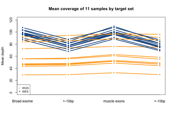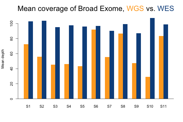 I’ll start with some descriptive statistics and then get gradually into the analysis. Although the samples were sequenced to a variety of mean exonic depths in both WES and WGS, it is categorically true across all 11 samples that the mean exonic depth of the WES data is higher than the WGS data:
