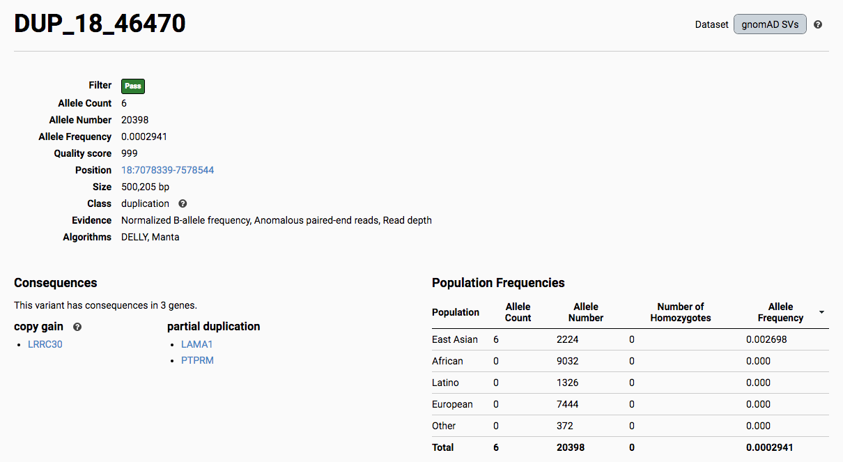 To find more information about an individual variant, you can click on the variant ID in the table or on the variant itself in the track to access the variant page. This page features additional details on the variant, including which algorithms and evidence types contributed to its discovery, its allele frequencies across continental populations, and a full list of all predicted genic consequences.