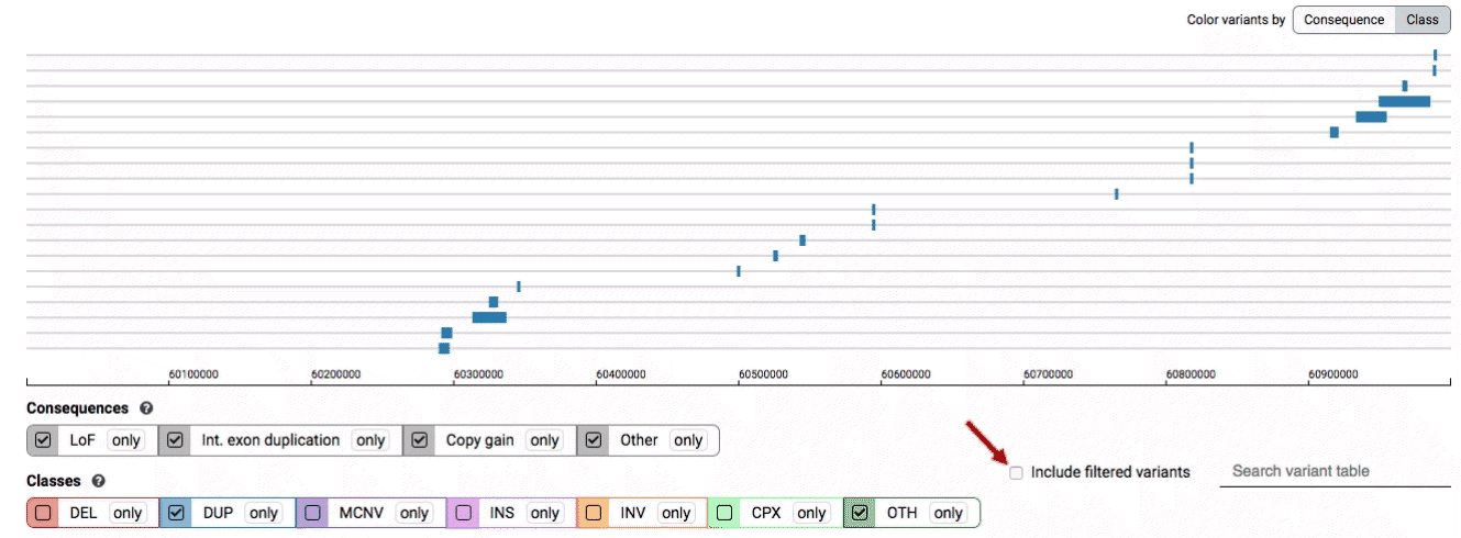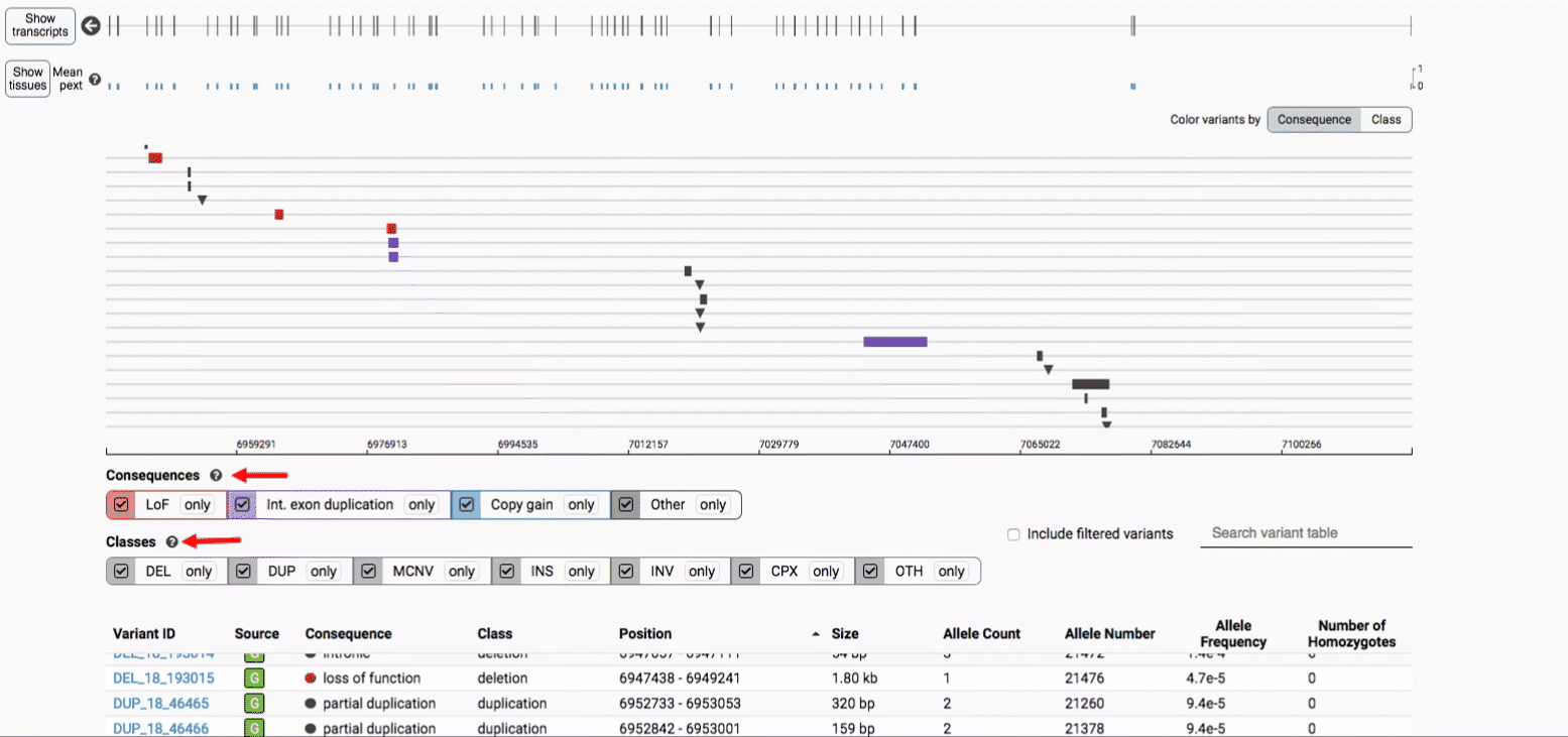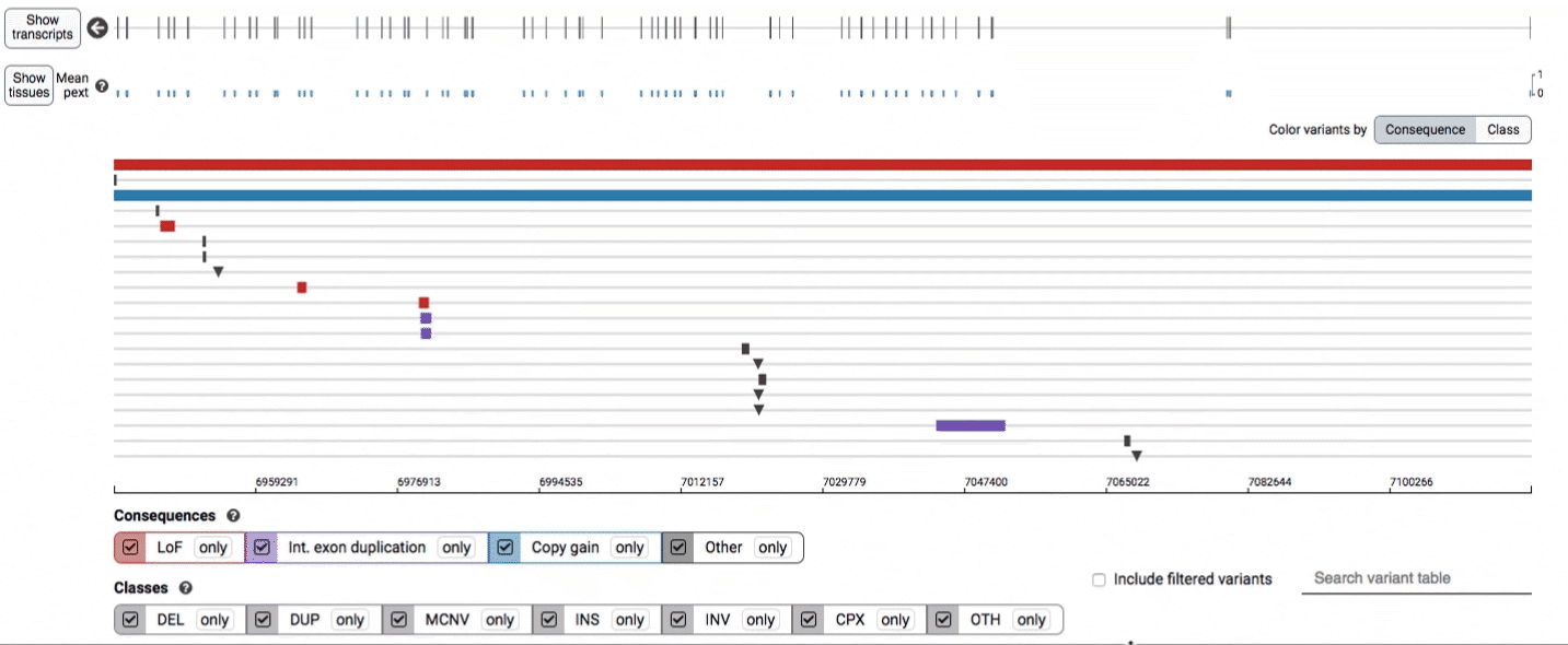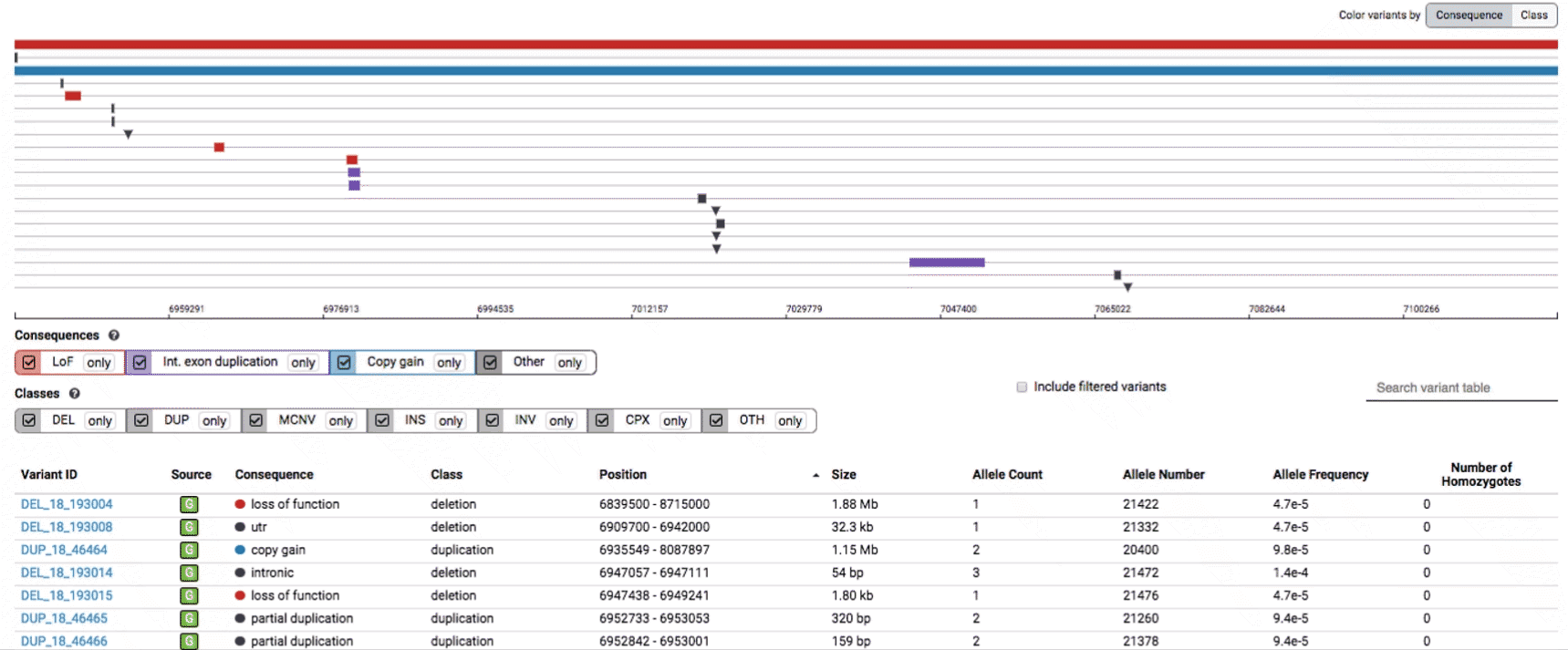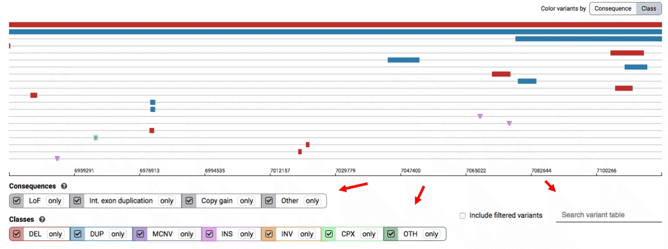 We provide two options for coloring the SV data: color-by-consequence and color-by-class. You can toggle between these modes using the button directly above the variant track on the right side of the page. The current color key will be reflected by the colors used for the two sets of filter buttons found directly below the variant track.