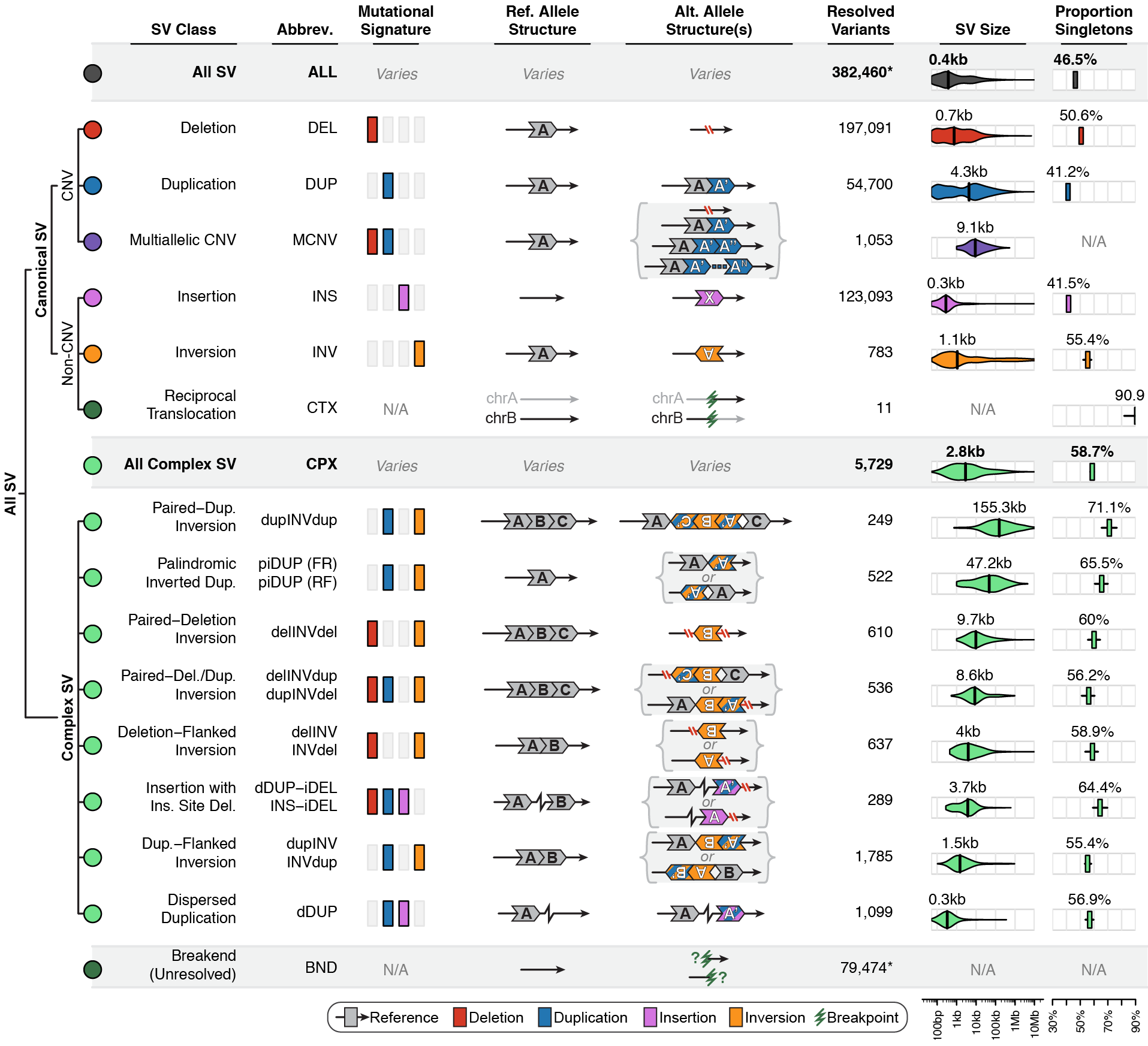 Across the full gnomAD-SV dataset, we discovered a total of 498,257 distinct SVs appearing in one or more genomes, 382,460 of which (76.8%) were completely resolved and appeared in a subset of 12,549 unrelated genomes used in the formal analyses presented in the gnomAD SV preprint. We categorized SVs into the following mutational classes (note: numbers correspond to the final set of SVs from 12,549 unrelated genomes used in the gnomAD SV preprint):