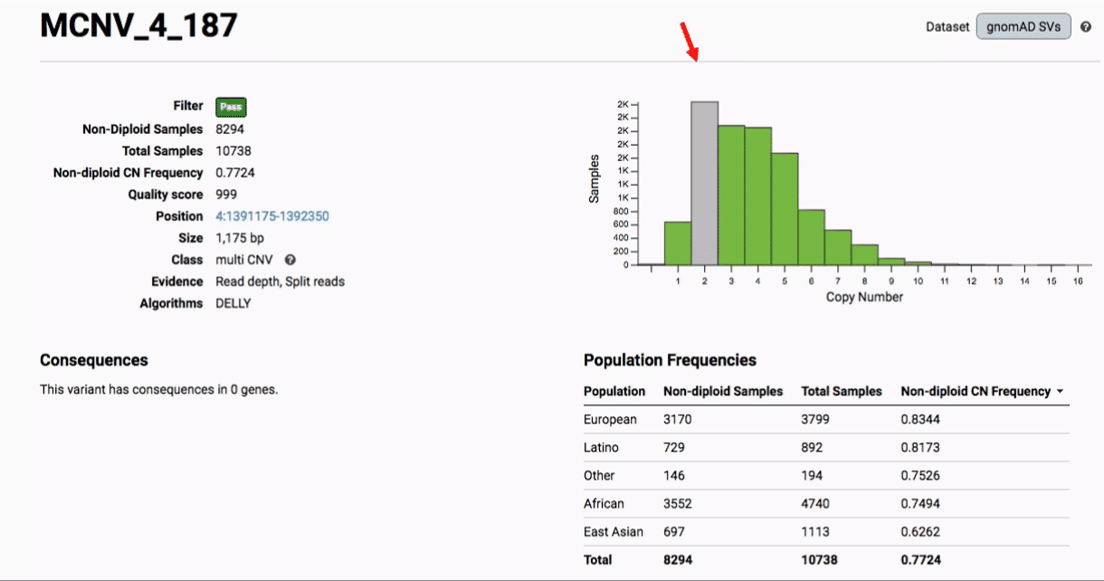 Multiallelic CNVs, which are sites in the genome that have a variable range of copy numbers across individuals in the population, have an extra feature for their variant pages: the distribution of copy numbers in the gnomAD-SV cohort. While we do not phase these regions and/or resolve their individual underlying copy number haplotypes, we provide an aggregate copy number for that locus in sum across both chromosomes per individual. This is represented as a histogram, which has a mouse-over tooltip to show how many individuals are present at each copy state.