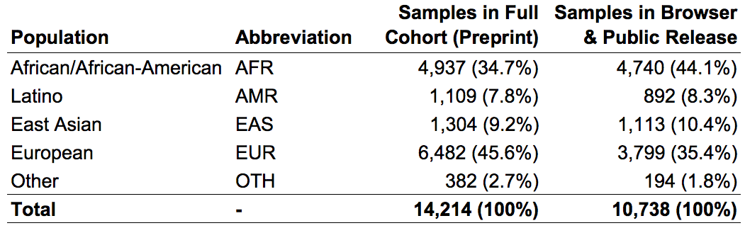 As with the SNV & indel callset, the subset of 10,738 genomes represented in the gnomAD browser have been screened to remove first-degree relatives and samples with documented pediatric or severe disease. Thus, the publicly available SV data from these 10,738 genomes represents a relatively diverse collection of unrelated individuals that should have rates of most severe diseases equivalent to, if not lower than, the general population.