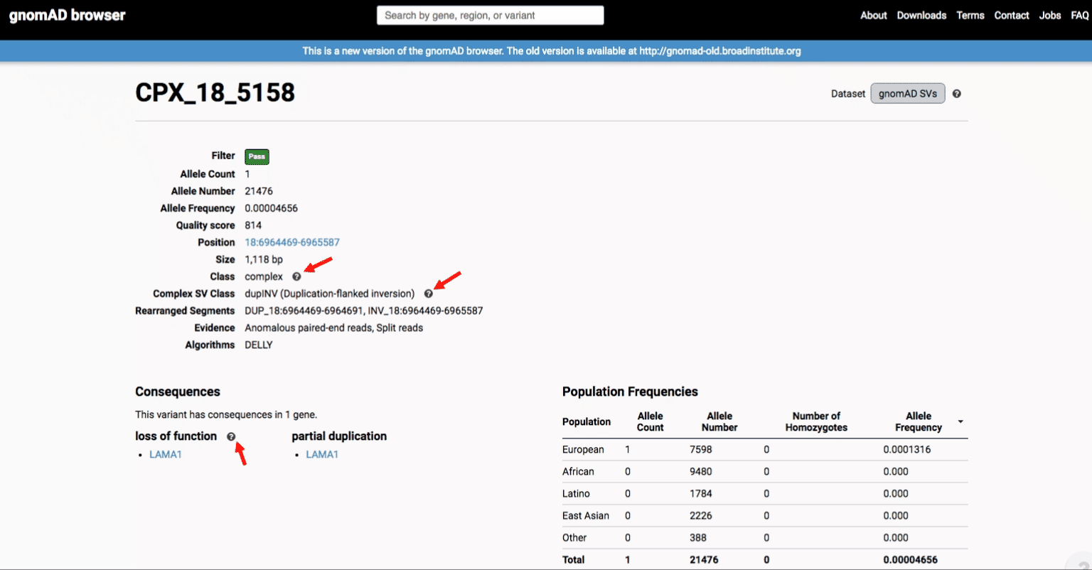 If you’re ever unsure about what a given SV represents or what its functional consequences mean, visit that variant’s page and click on any of the “?” help buttons for more information. This is particularly useful for complex SVs, where each help popup gives a graphical representation of the alternate allele structure.