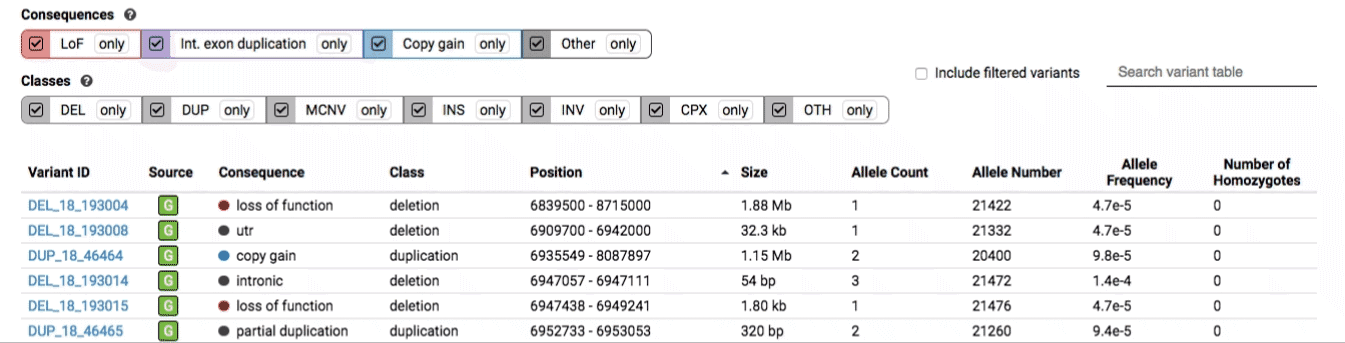 The variant table provides selected metadata for each variant displayed in the variant track, including allele frequencies, consequences, number of homozygotes, coordinates, and size.